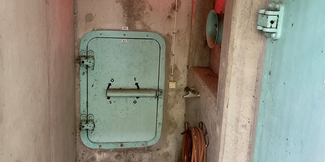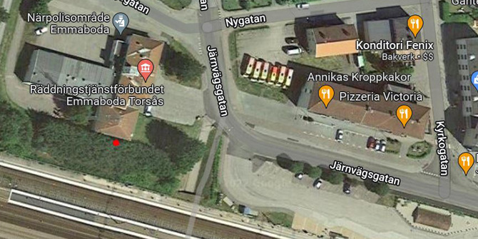 Kranen finns till vänster om ingången till brandstationen, vid husväggen som vetter på järnvägen och vid trappnedgången.