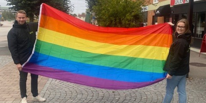 Frida och Anton hissar Prideflaggan