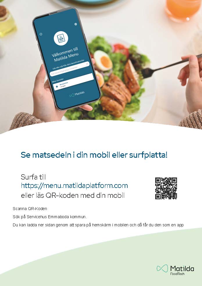 Vår ambition är att servera näringsriktig mat i trivsam miljö. Lunch serveras dagligen mellan klockan 12.00-13.30 i våra restauranger, i allaktivitetshusen, som finns i Algutsboda, Emmaboda, Långasjö och Vissefjärda. Här hittar du veckans och månadens meny.