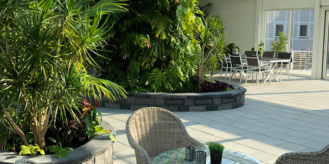 I vinterträdgården har vi valt att skapa en mysig atmosfär med porlande vatten, belysning och etanolspis. Tillsammans skapar de olika elementen en harmonisk och avkopplande miljö.