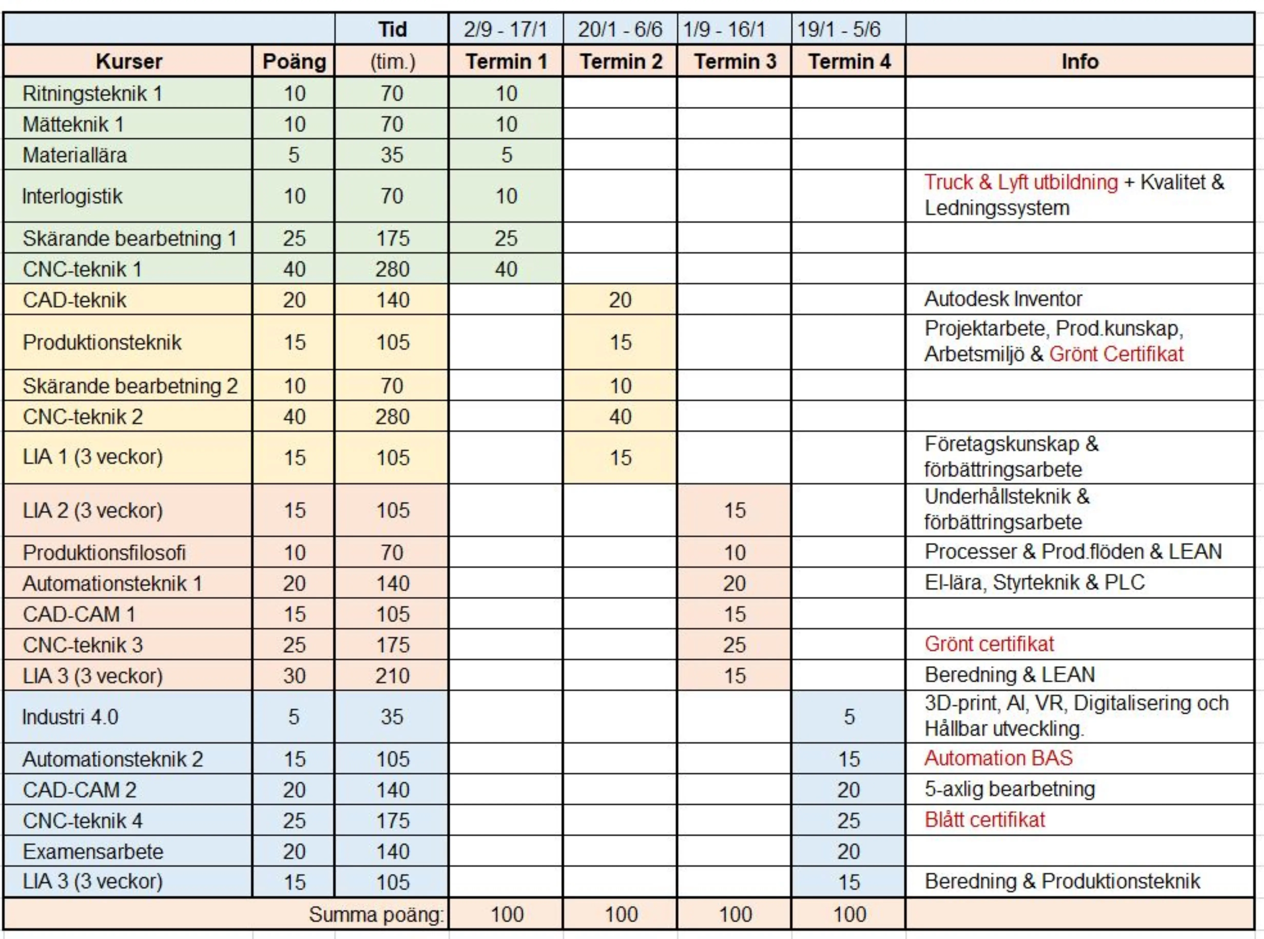 Den moderna CNC-tekniken är central i tillverkningsprocessen för olika produkter, och utbildningen syftar till att ge deltagarna färdigheter för att hantera, övervaka och programmera datorstyrda maskiner. I utbildningen ges också alla studerande möjlighet till branschcertifieringar enligt Skärteknikcentrums tre certifieringar - CNC Teknik 2017 Grön och Blå nivå samt Automation, BAS.'